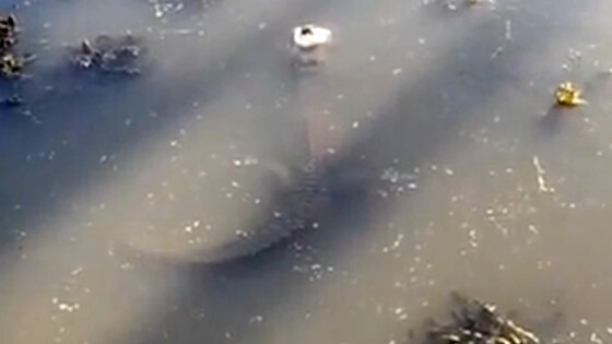 «Это животное пребывает в спячке, его сердце бьется со скоростью три удара в минуту. Ребята, это потрясающе. Смотрите, именно так аллигаторы и выживают во льду», — комментирует кадры Саураж.