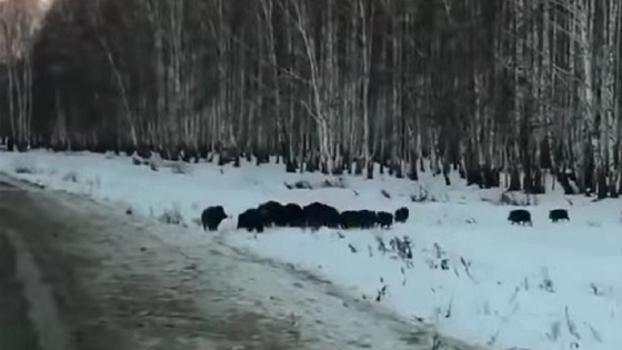 На трассе в Омской области сняли на видео огромное стадо диких кабанов из 30 особей