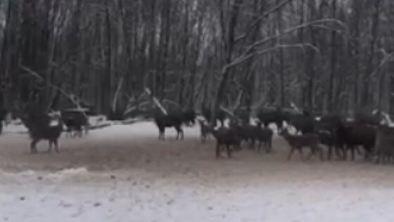 В ней едут несколько мужчин, которые наблюдают из окон за медленным передвижением копытных рядом с установленными кормушками. Численность стада превышает 50 голов, в нем попадаются и самцы, и самки с маленькими детенышами.