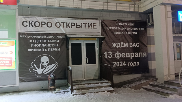 В Свердловском районе Перми 13 февраля откроется «департамент по депортации инопланетян». Такая вывеска появилась на одном из бывших магазинов в многоквартирном доме. Фотографию необычного анонса прислал в редакцию читатель URA.RU.