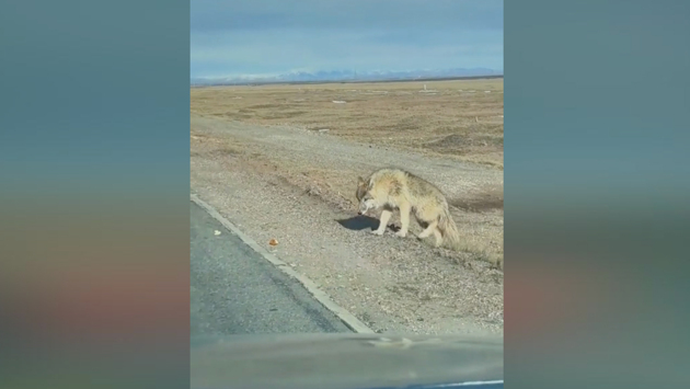 В китайской провинции Цинхай на видео засняли дикого волка, который заметно поправился и продолжает выпрашивать еду у проезжающих по трассе местных жителей и туристов.