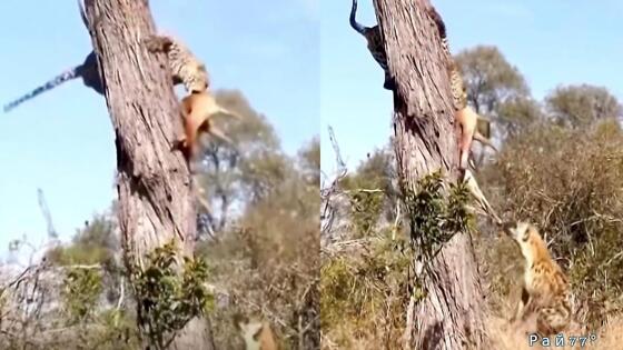 Гиена подкараулила возле дерева невезучего леопарда и забрала у него добычу: видео