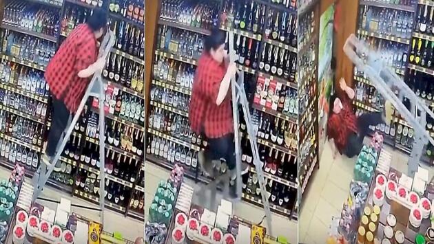 Доскакалась: продавщица, прыгая на стремянке, недооценила свой вес: видео