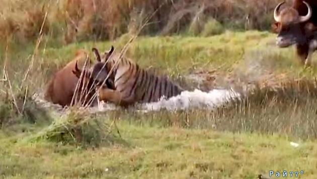 Буйвол прервал трапезу тигра и спас своего сородича: видео