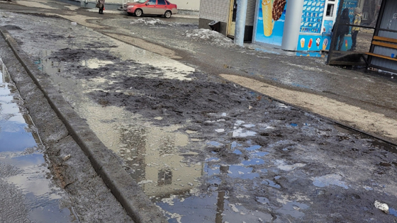 На кадрах можно заметить, что тротуар, прилегающий к остановке, состоит из грязи. Жители города выражают недовольство, так как такое состояние дороги усложняет перемещение при выходе из автобуса.