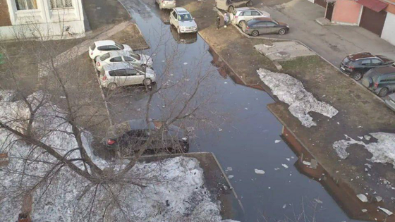 Жители Междуреченска заметили настоящую реку под окнами многоквартирного дома. По ней плывут льдины.