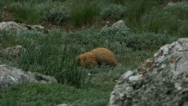 Так, один из членов семьи усердно заготавливает новую травяную подстилку для зимовочной камеры в норе. Дело в том, что зимовать сурки начнут примерно… в середине июля – именно в это время звери затыкают землей входы в нору и укладываются в спячку, которая из летней переходит в зимнюю.