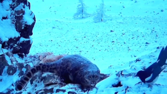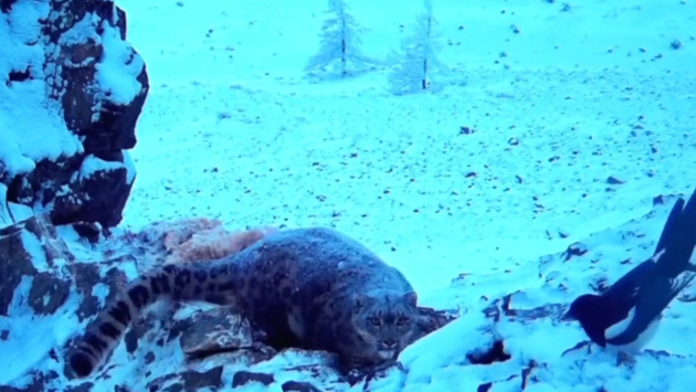 Снежный барс, охраняющий добычу от птиц, попал на видео