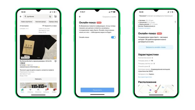 Продавцы могут включать онлайн-показы для каждого объявления, что делает его более привлекательным для потенциальных покупателей. Кнопка «Запросить онлайн-показ» теперь доступна в объявлениях, помеченных специальным бейджем в ленте поиска.