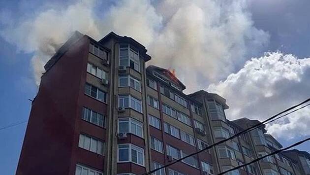 На кадрах видно полыхающую квартиру, а также большое количество дыма, поднимающегося от крыши дома.