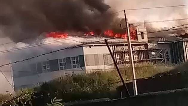На кадрах видна охваченная огнем кровля здания, вверх поднимается черный столб дыма. Затем можно заметить струи воды из пожарных стволов.