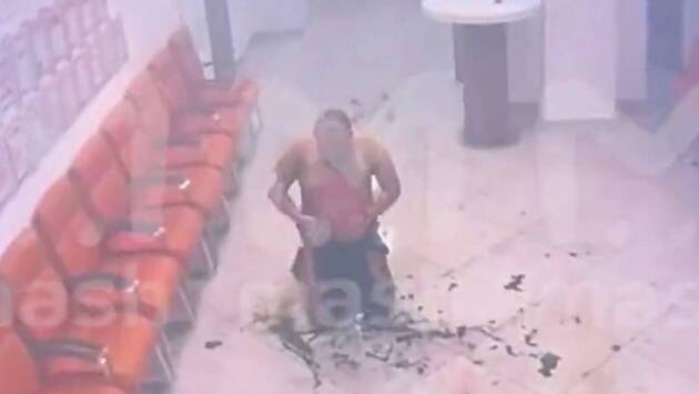 Мужчине с трудом удается встать на ноги. Он неуверенной походкой направляется к выходу, теряя на ходу то, что осталось от его брюк. Увидев идущего к нему человека с огнетушителем — предположительно, охранника, — пострадавший разворачивается и поднимает вверх руки.