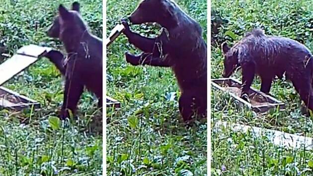 На размещенном видео запечатлен медведь, который подошел к деревянному ящику с зерном и отодвинул лежащую на нем крышку. Он понюхал лакомство, съел небольшую порцию и ушел.