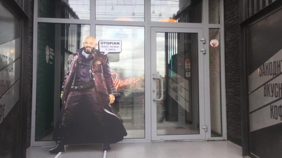 Как говорят владельцы кофейни с картонным певцом, её атмосфера вдохновлена неоновым ретро-футуризмом в сочетании с бетонно-зеленой эстетикой. Впрочем, популярного шансона здесь также не чураются.