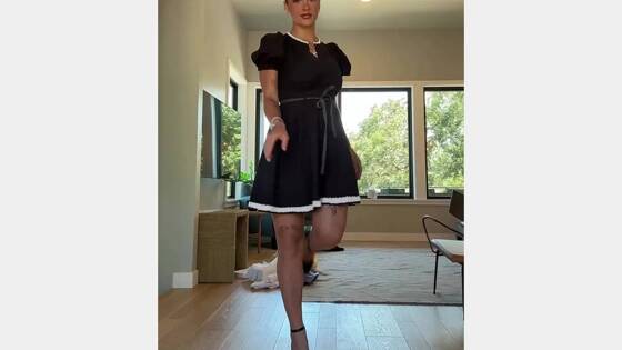 В начале видео 23-летняя инфлюэнсерша запечатлена в черном бархатном платье длины мини, капроновых колготках и лакированных туфлях. После этого она переоделась и предстала в облегающем мини-платье и остроносых туфлях на шпильках. Автор ролика разделила волосы на ровный пробор и сделала аккуратный пучок, а также нанесла на лицо макияж в стиле smoky eyes.