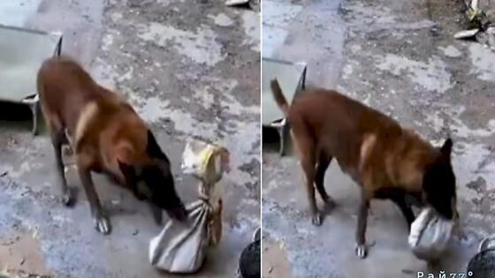 Видеокамера, установленная над жилищем, зафиксировала момент, когда оставленный без присмотра свёрток с птицей внутри, привлёк внимание четвероногого сторожа, который утащил в сторону пакет и освободил курицу.