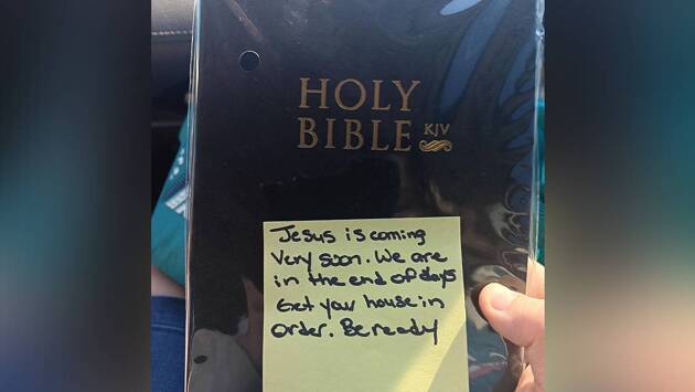 По словам девушки, она обнаружила Библию, когда выходила выбрасывать мусор. На опубликованной ею фотографии видно, что книга запечатана в прозрачную обложку вместе с запиской. «Иисус придет уже скоро. Мы на пороге конца дней. Приведи свой дом в порядок. Будьте готовы», — гласит послание. Автор не стал подписываться.