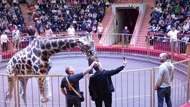 Жирафа вывели к зрительному залу под аплодисменты. Представительницам прекрасного пола предложили поцеловаться с жирафом. Желающих оказалось несколько десятков.