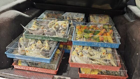 Контрабандисты разместили в тесных ящиках особей розовощекого неразлучника, нимфового попугайчика и краснолобого прыгающего попугая. При этом 88 из обнаруженных в машине птиц относились к последней породе, которая находится под защитой Конвенции о международной торговле видами дикой фауны и флоры, находящимися под угрозой исчезновения (CITES).