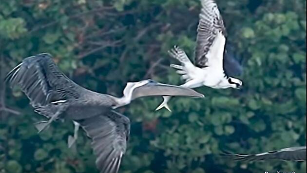 Со слов автора видео, в последнее время пеликаны осмелели и всё чаще стали нападать на скоп, порой отнимая у них добычу.