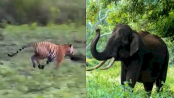 Краснокнижный красный волк (Дхоле) привлёк внимание полосатого хищника, который бросился догонять добычу, но вынужден был отступить, встретив на своём пути агрессивного слона.