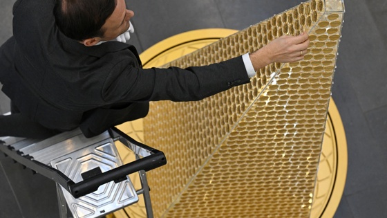Инсталляция представляет собой акриловую пирамидальную конструкцию, на которой разместили 2024 золотые монеты "Венская филармония" весом в одну унцию каждая. А в качестве звезды на вершине этого рождественского "дерева" поставили монету такого же дизайна, но весом в 20 унций. Конструкцию, в которой 63 килограмма чистого золота, установили на платформе, имитирующей дизайн Золотого зала филармонии.