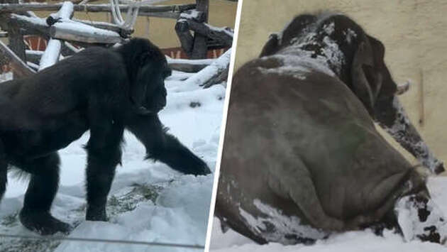 В Казанском зоопарке показали забавную реакцию слона и гориллы на снег