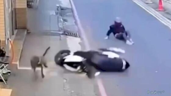 Перебегающий дорогу пёс врезался в мотоциклистку и опрокинул её на землю, после чего покинул место столкновения. Случайные прохожие помогли девушке подняться и покинуть проезжую часть.
