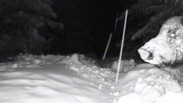 Камера зафиксировала, как животное разрывает снег в поисках пищи и заглядывает в объектив.