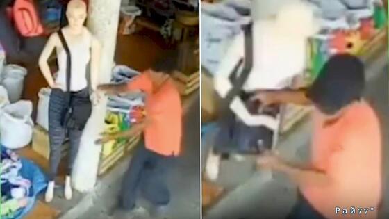 Незадачливый воришка перепутал манекен с живым человеком и стал владельцем бутафорской сумки, отобрав её у куклы, стоявшей возле лавки, где торговали одеждой и обувью, на рынке в городе Варнес (провинция Варнес, Боливия).