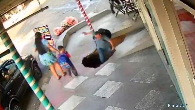 Эпизод был зафиксирован камерами видеонаблюдения, размещёнными возле аптеки. На видео, полученном Рай77°, можно увидеть момент, когда тротуар обрушивается и мужчина исчезает в яме, испугав проходивших мимо женщину с ребёнком.