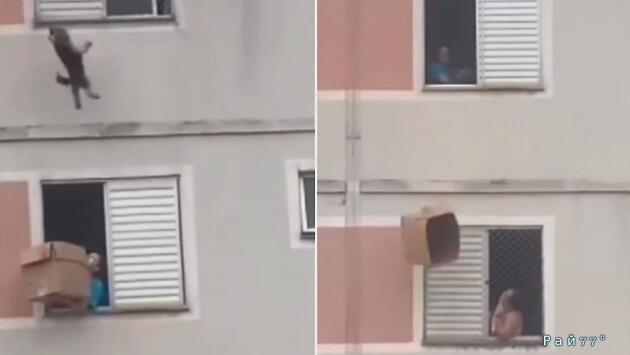 Пытаясь спасти животное, женщина выставила из окна своей квартиры картонную коробку. Когда четвероногий питомец упал, спасательнице удалось поймать его внутри коробки.