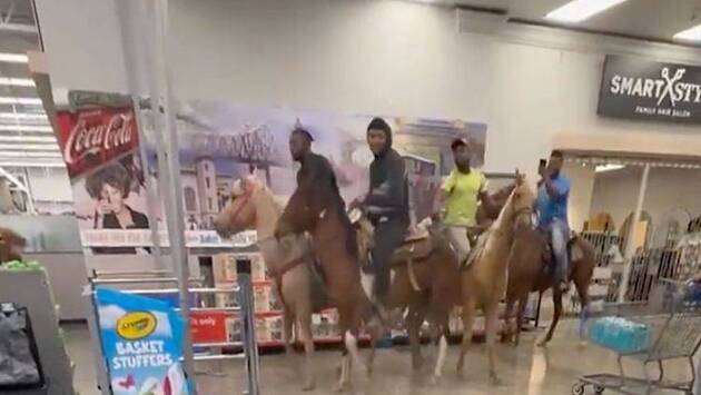 Четыре ковбоя на лошадях ворвались в супермаркет и попали на видео