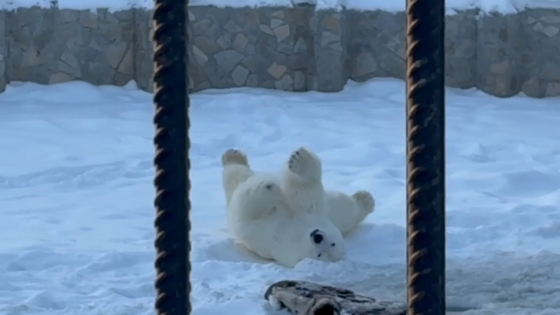 На видео медведица с удовольствием катается и кувыркается в снегу.
