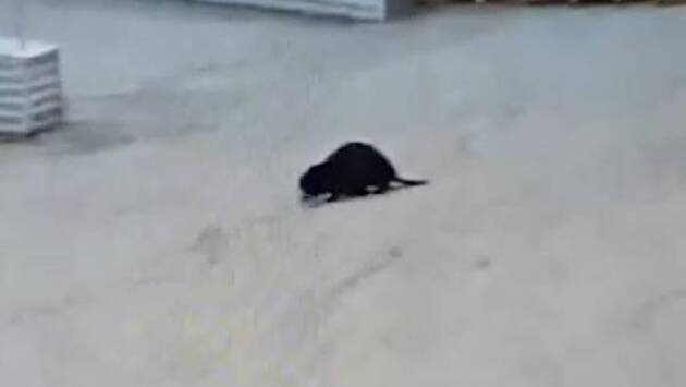 На съемке с камеры видеонаблюдения показано, как бобер неспешно идет по площадке среди строительных материалов. Затем на видео показали, как он топчется по зеленому газону, двигаясь к лавочкам.