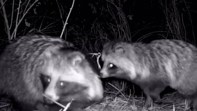 На видео показано, как в ночи пара енотовидных собак увиделась в укромном месте. Там животные неспешно обнюхались. Тогда же одна из енотовидных собак «куснула» своего партнера и затем посмотрела по сторонам.