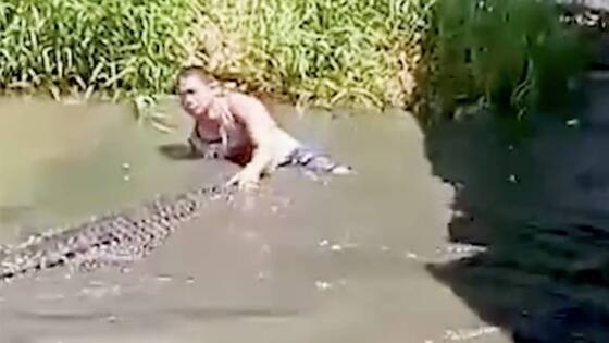 Турист перепутал живого крокодила со статуей, оказался у него в пасти и попал на видео
