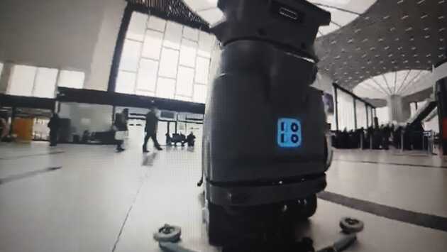 Беспилотный автоматизированный уборщик разъезжает по залу на первом этаже воздушной гавани. И убирает не только сухой мусор, но и разлитые на полу напитки.
