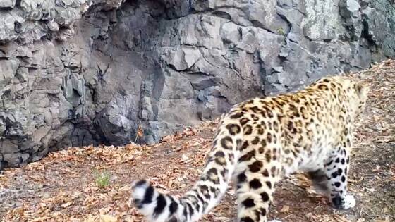 На видео показано, как дальневосточный леопард вальяжно проходит мимо скалы. Там же хищник ненадолго останавливается, оглядывается и затем идет дальше.