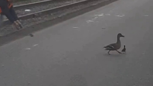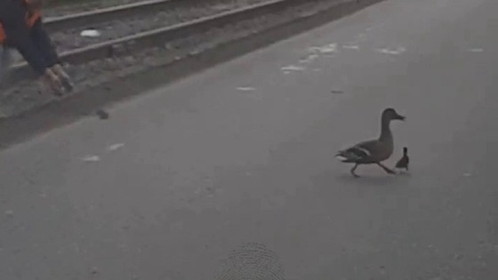 В Новосибирске водитель трамвая спасла утку с утятами на улице Мира. Птенцы не могли преодолеть рельсы.