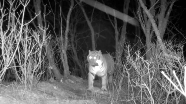 Случай произошел еще зимой, однако найти кадры удалось только сейчас. На видео, которое записала фотоловушка по соседству, видно, как тигр несет в зубах свою «добычу». В определенный момент хищник ложится на землю, также слышны характерные звуки жевания.