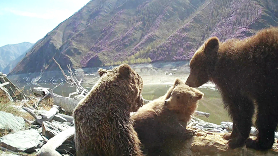 Запись с тремя косолапыми хищниками обнаружили при проверке фотоловушек, установленных на охраняемой территории, сотрудники заповедника и представители Хакасского отделения РГО.