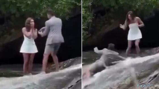 Парень принял незапланированные водные процедуры, делая предложение девушке