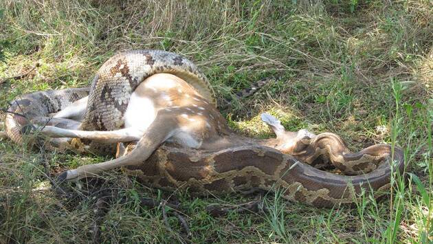 Биолог USGS Марк Сандфосс рассказал, что сделал странное наблюдение, когда следил за пищевыми привычками темных тигровых питонов. Однажды он увидел, что набитый добычей живот одной из змей не уменьшается, хотя должен. Спустя пару дней Сандфосс нашел рядом с освободившейся от бремени змеей практически непереваренного белохвостого оленя.