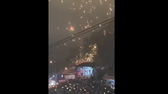 На видео, которые мгновенно разлетелись по сети, виден ужас происходящего: огненные фрагменты падают прямо в толпу и на деревья, из-за чего на склоне холма вспыхивает пожар. На кадрах слышны панические крики людей, передает NTDTV.