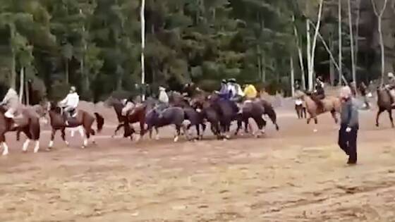 На выложенных кадрах мужчины — как утверждается, из Киргизии и Таджикистана — разъезжают по полю в Подмосковье на конях и пытаются выхватить друг у друга тушу козла, чтобы забросить ее в импровизированные ворота.