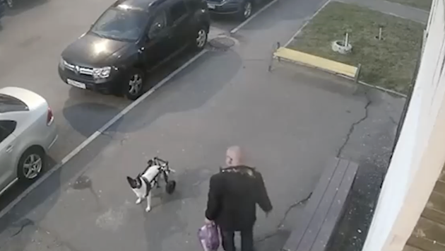 Всё происходящее записали камеры наблюдения, установленные на многоэтажке. На записях видно, что у подъезда стоит небольшая собака в специальном приспособлении на колёсиках. У неё травмированы задние лапы, а колёсики помогают передвигаться.