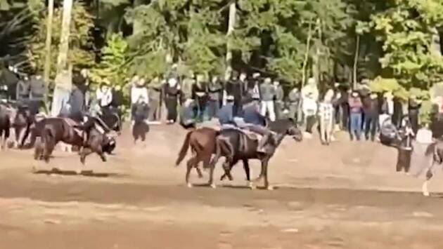На разошедшихся по сети кадрах мужчины, предположительно из Киргизии и Таджикистана, разъезжают по полю в Подмосковье на конях и пытаются выхватить друг у друга тушу козла ради ее броска в импровизированные ворота.