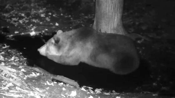 На размещенных кадрах видно, как хищник ночью, заметив воду, сначала неспешно сел в нее, а затем уложил голову и прикрыл глаза. При этом видно, что медведь тяжело дышал, запыхавшись после прогулки.