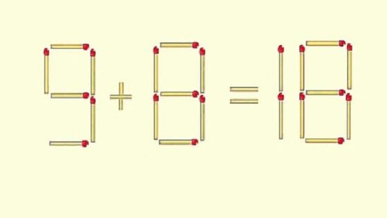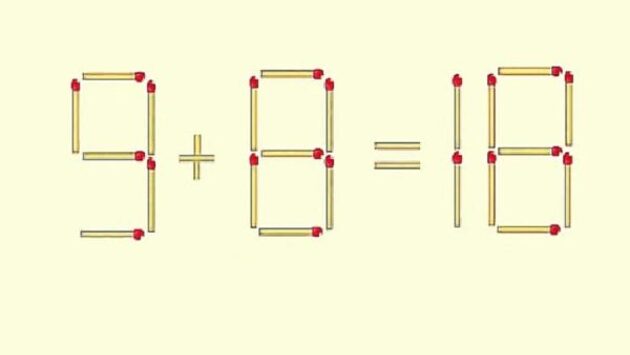 Перед вами задача: дано равенство 9 + 8 = 18 с ошибкой. Чтобы решить головоломку, вам нужно сдвинуть с места всего одну спичку. Тогда получите верное уравнение.